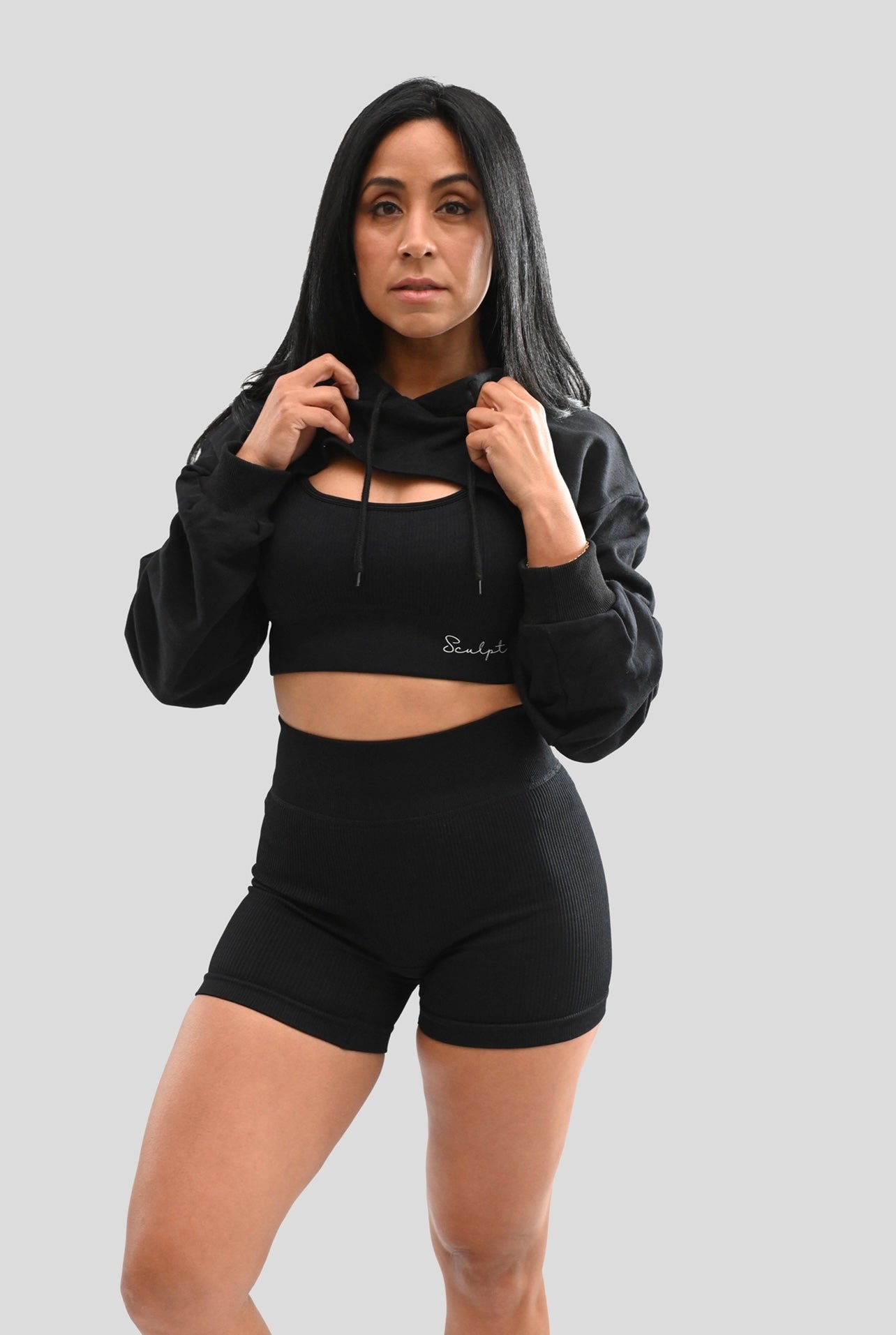 Stay sporty and stylish in our Hooded Crop Sweater. Designed to go hand in hand with our biker shorts, seamless or contour leggings. Your leisure days just got more interesting. Complete the look with our essential ribbed bra.